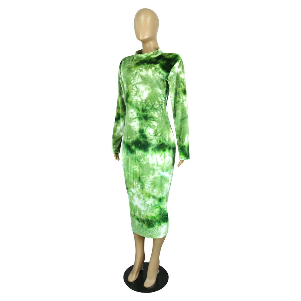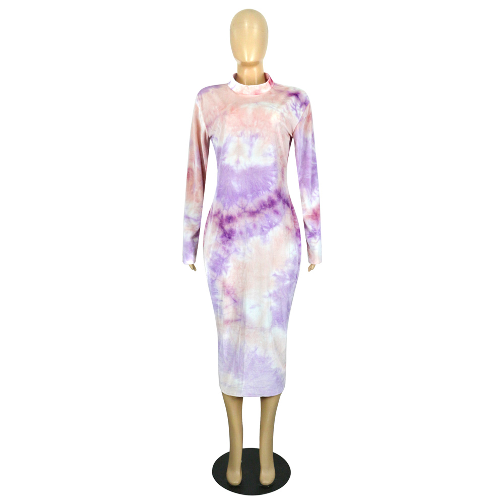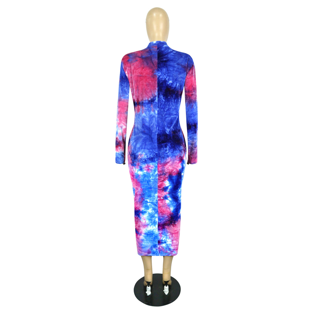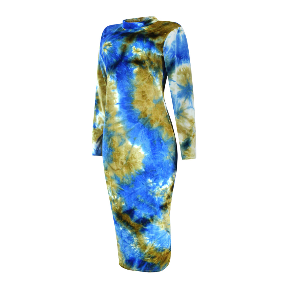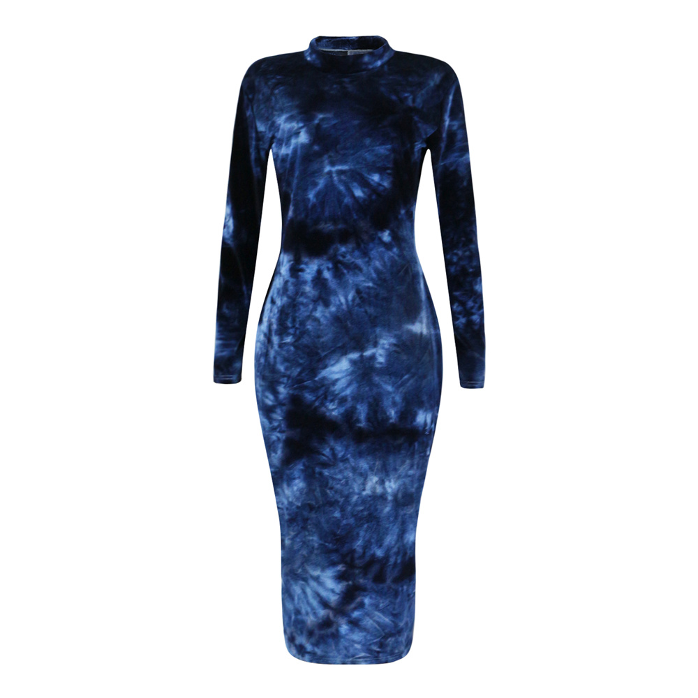 Blue Tie-dye Autumn Midi Dress Long Sleeve Plus Size Casual Dress PQSD040B